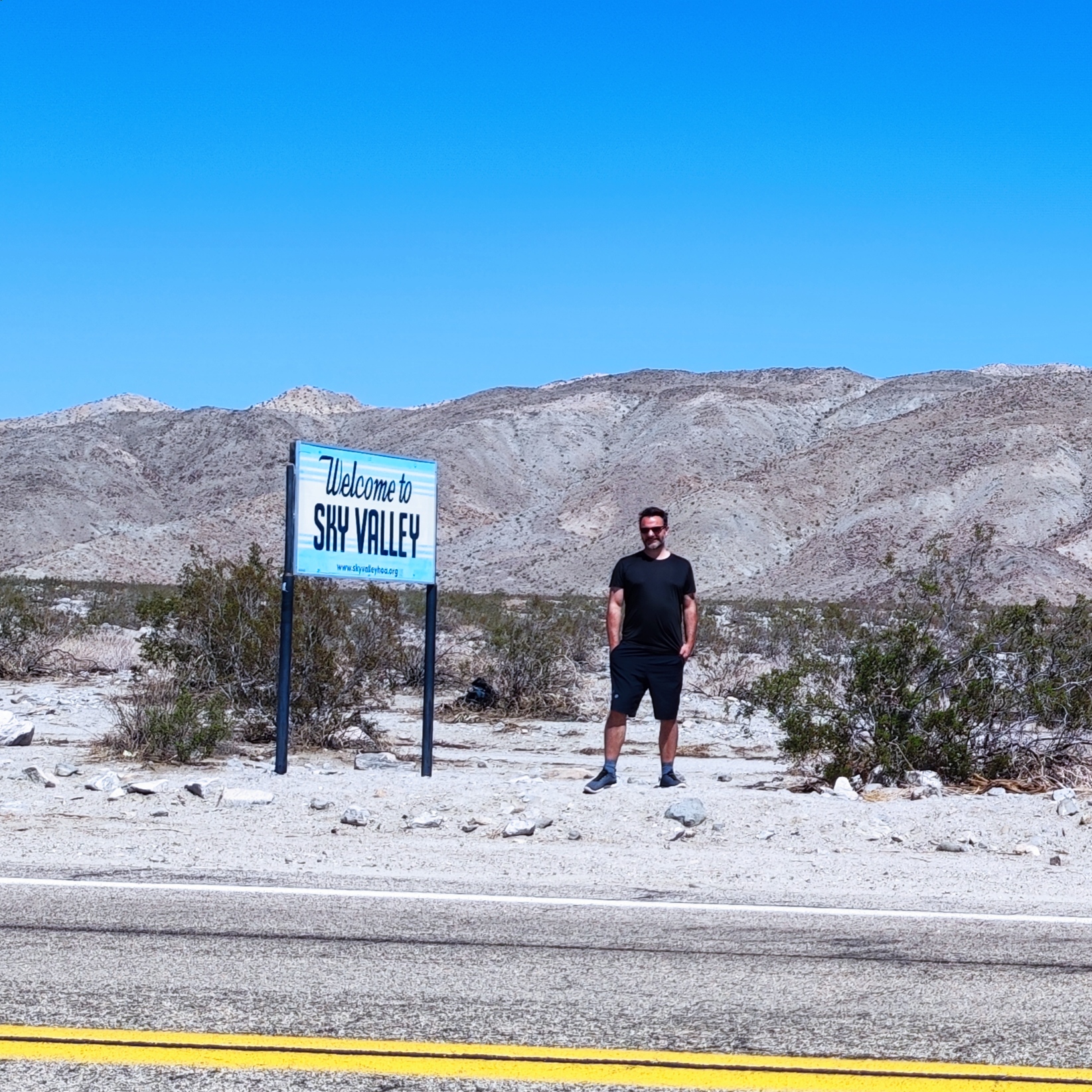 Gut ausgeruht und mit ausreichend Wasser und Benzin ausgestattet, starten wir zu unserem ersten Tag in der kalifornischen Wüste. Unsere Wahl fällt auf den Joshua Tree Nationalpark, der für seine spezielle Vegetation und eine Reihe ungewöhnlicher Steinformationen bekannt ist. Kurz nach der überall noch omnipräsenten kalifornischen Hitzewelle, gehen wir die Sache mit gebührenden Respekt an und entscheiden uns für eine Durchfahrt auf der Hauptroute mit einigen Stopps an interessanten Stellen. Bevor wir jedoch in den Nationalpark fahren, stoppen wir noch am „Welcome to Sky Valley“ Zeichen um der Desert Rock Band Kyuss Tribut zu zollen. Die Musik dieser Band ist tief verwurzelt in der rauhen und kargen Landschaft südlich des Nationalparks. Die Referenzen in ihren Texten bekommen einen neuen Bezug, wenn man den Ort betrachtet an dem die Desert Sessions in den 90er Jahren stattgefunden haben und dieser Musikstil geboren wurde.