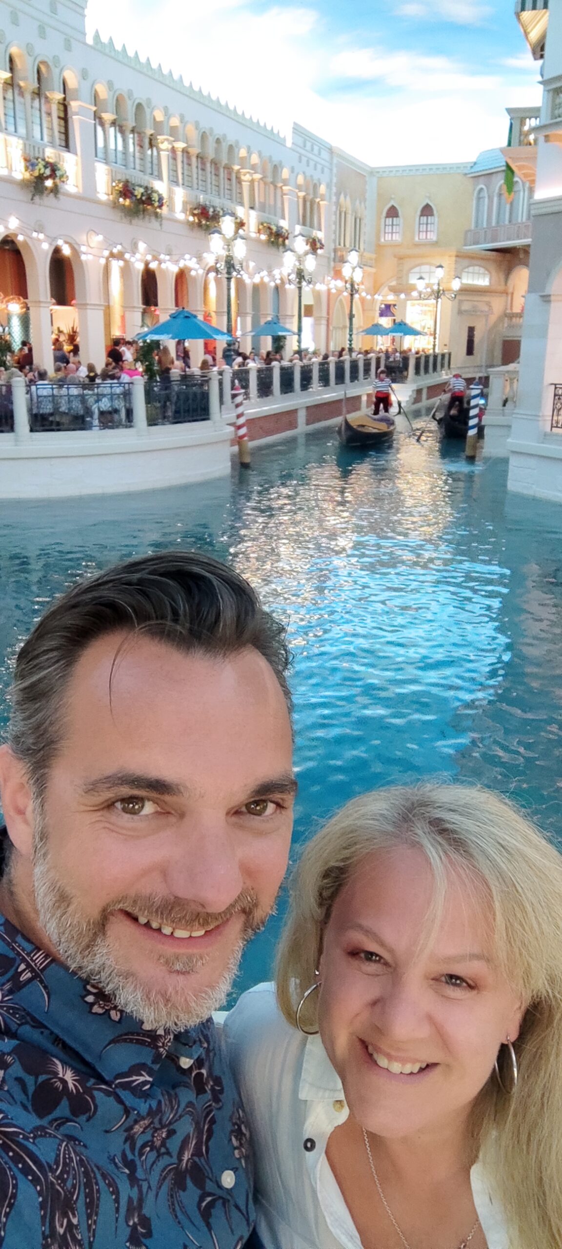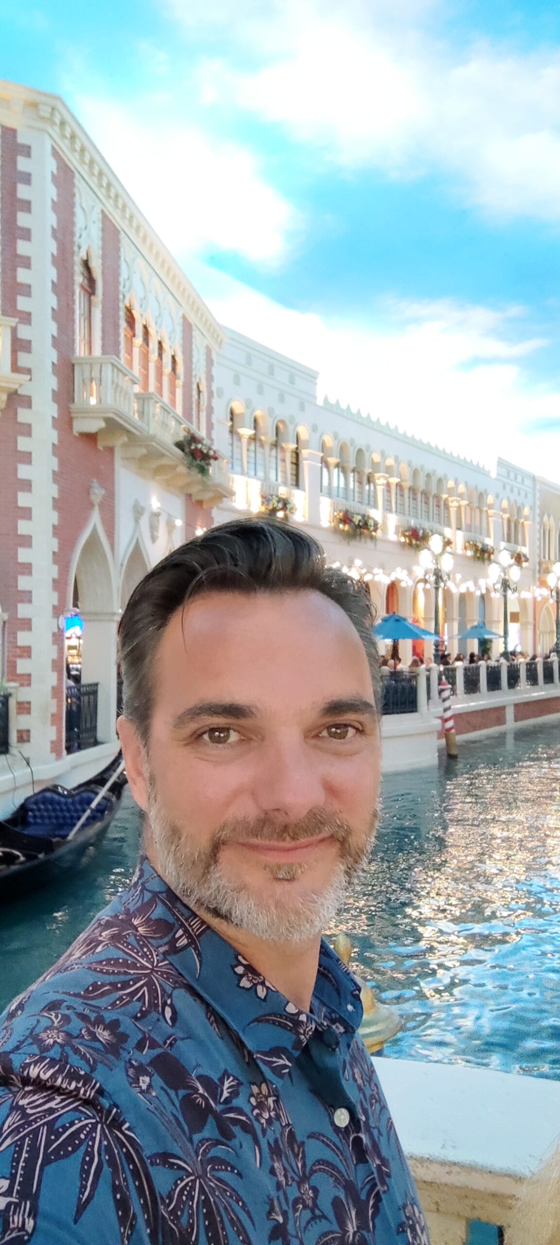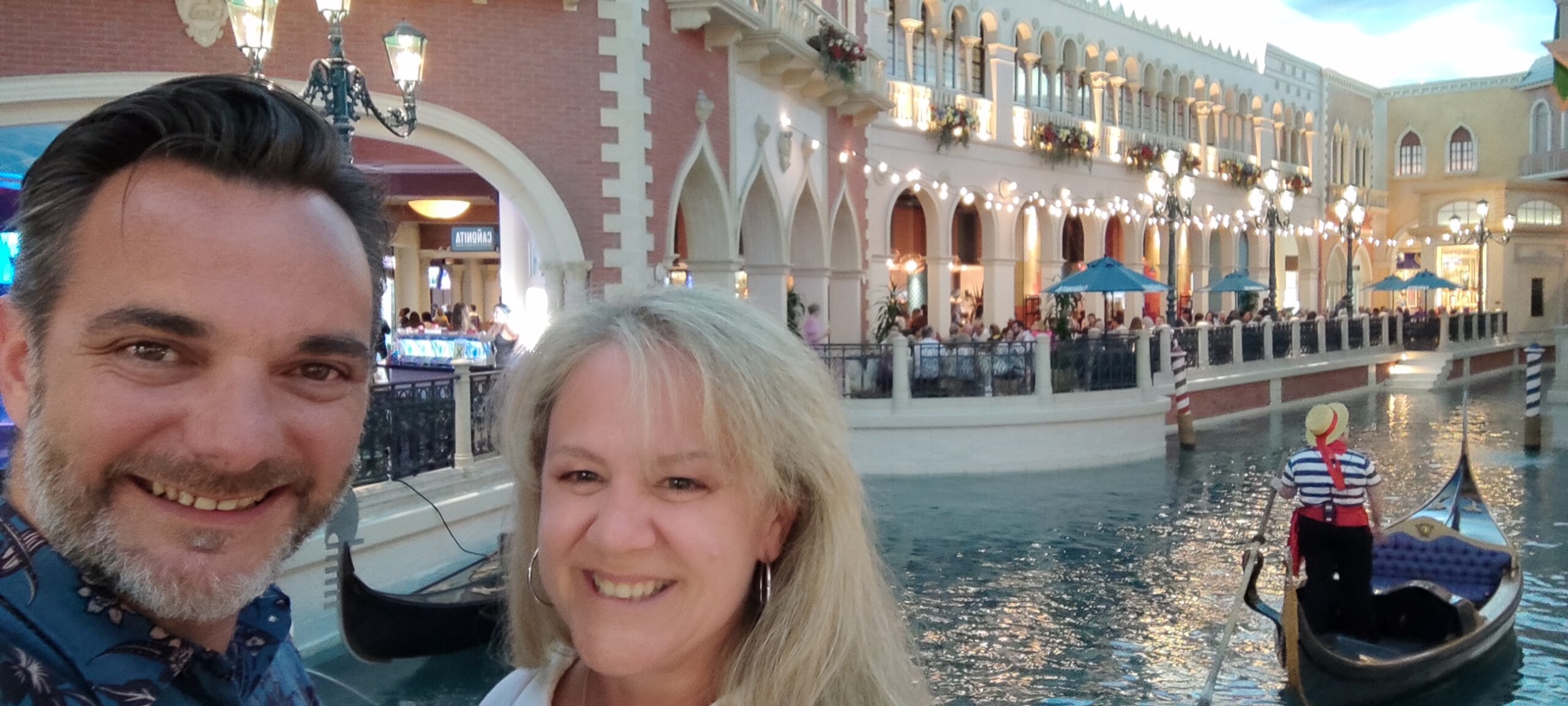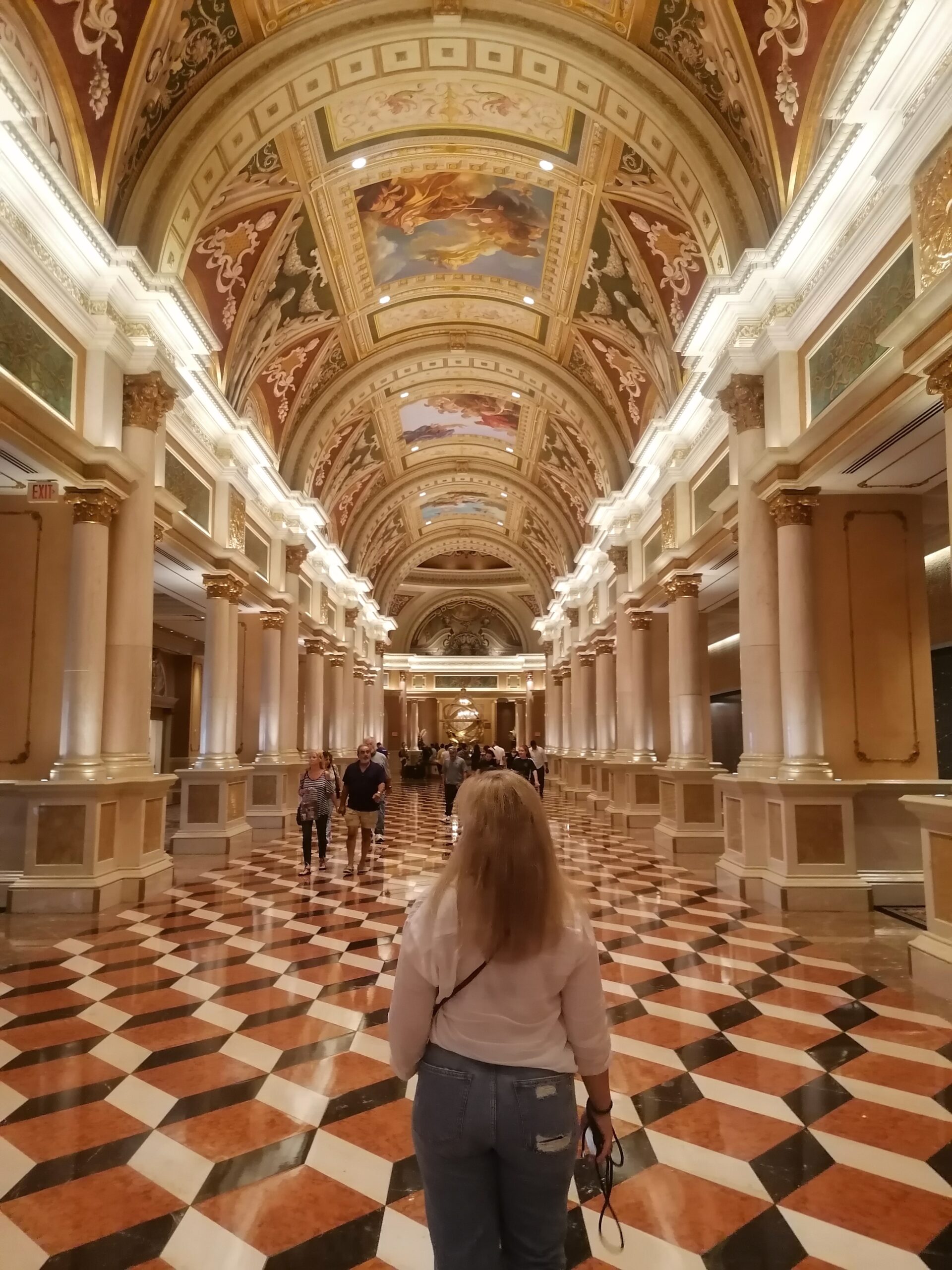 Der erste Eindruck ist ein heftiger Kontrast zu den Hotels, welche wir bisher auf unserer Reise gesehen haben: Alles ist pompös, riesig, und übertrieben in jeder Hinsicht. Dieses auf italienischen Flair getrimmte Hotel gehört zu den besseren und schöneren in der Stadt und hat sich ganz dem Thema „Bella Italia“ verschrieben. Das merkt man dann auch überall: An der Architektur, dem Dekor, der Fahrstuhlmusik etc, etc. Highlight unseres Hotels ist ein Indoor Canal Grande mit echtem Wasser und Gondoleris, sowie Tag und Nacht Szenarien auf den Palazzos und deren Restaurants und Shops. Irgendwie sehr schräg aber auch beeindruckend.