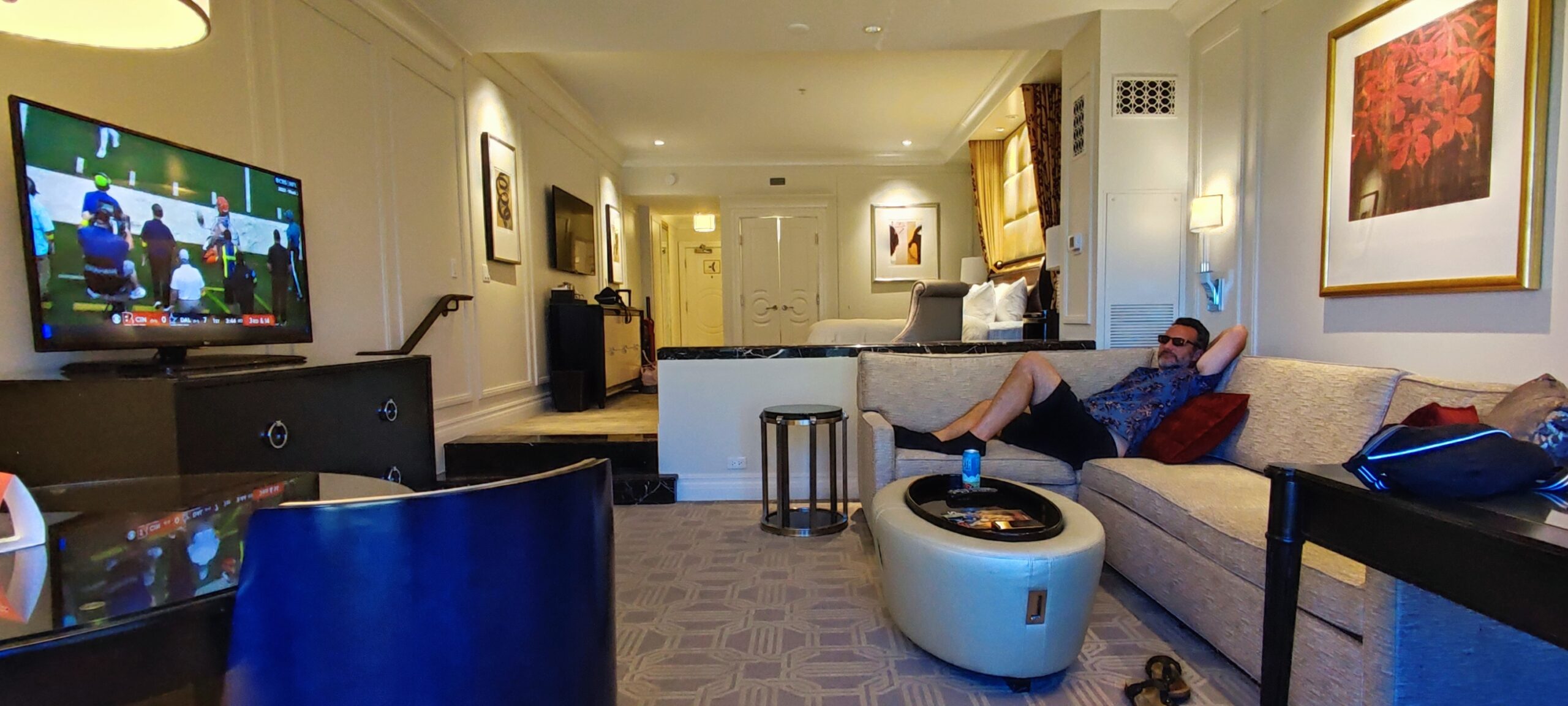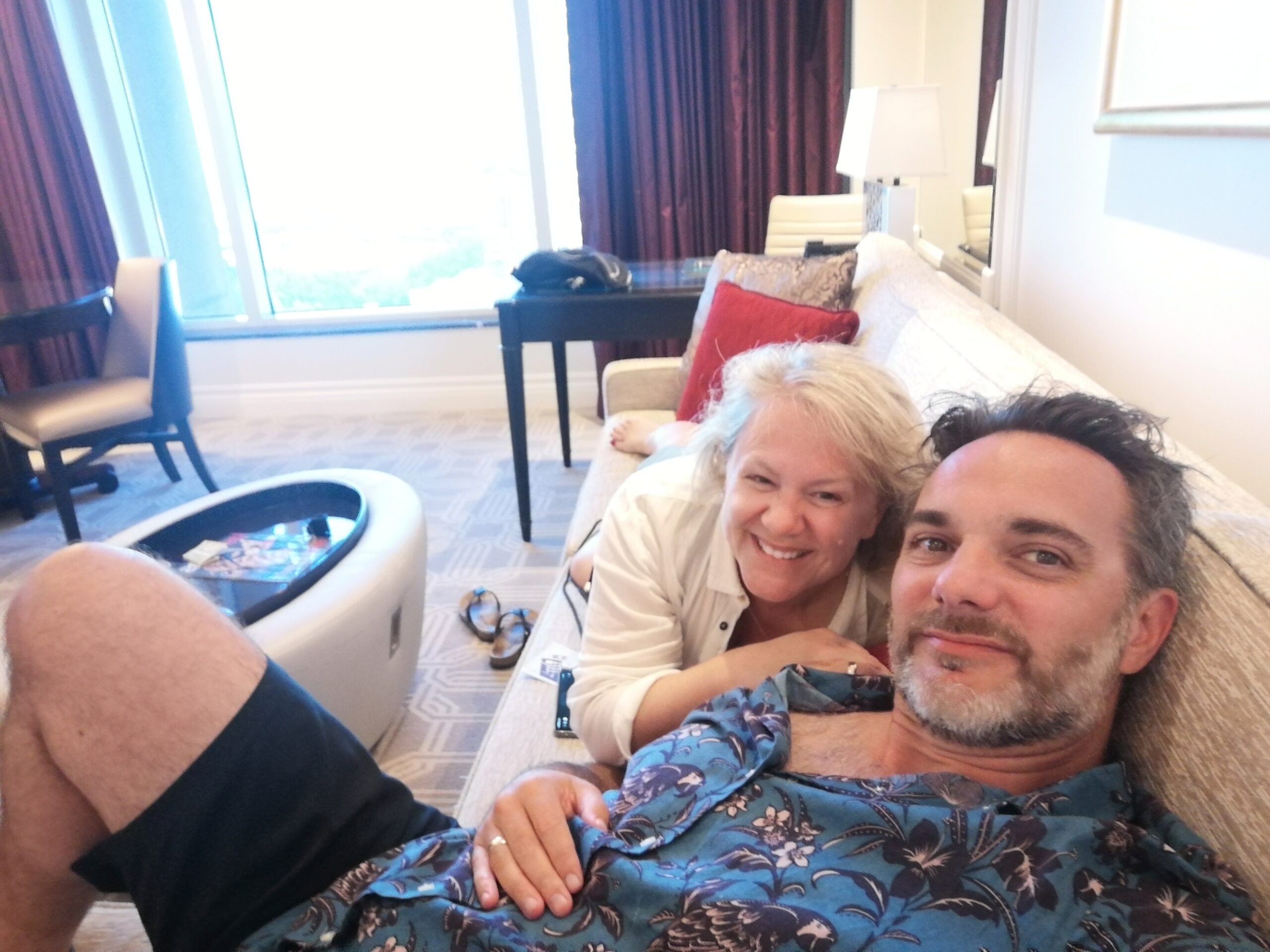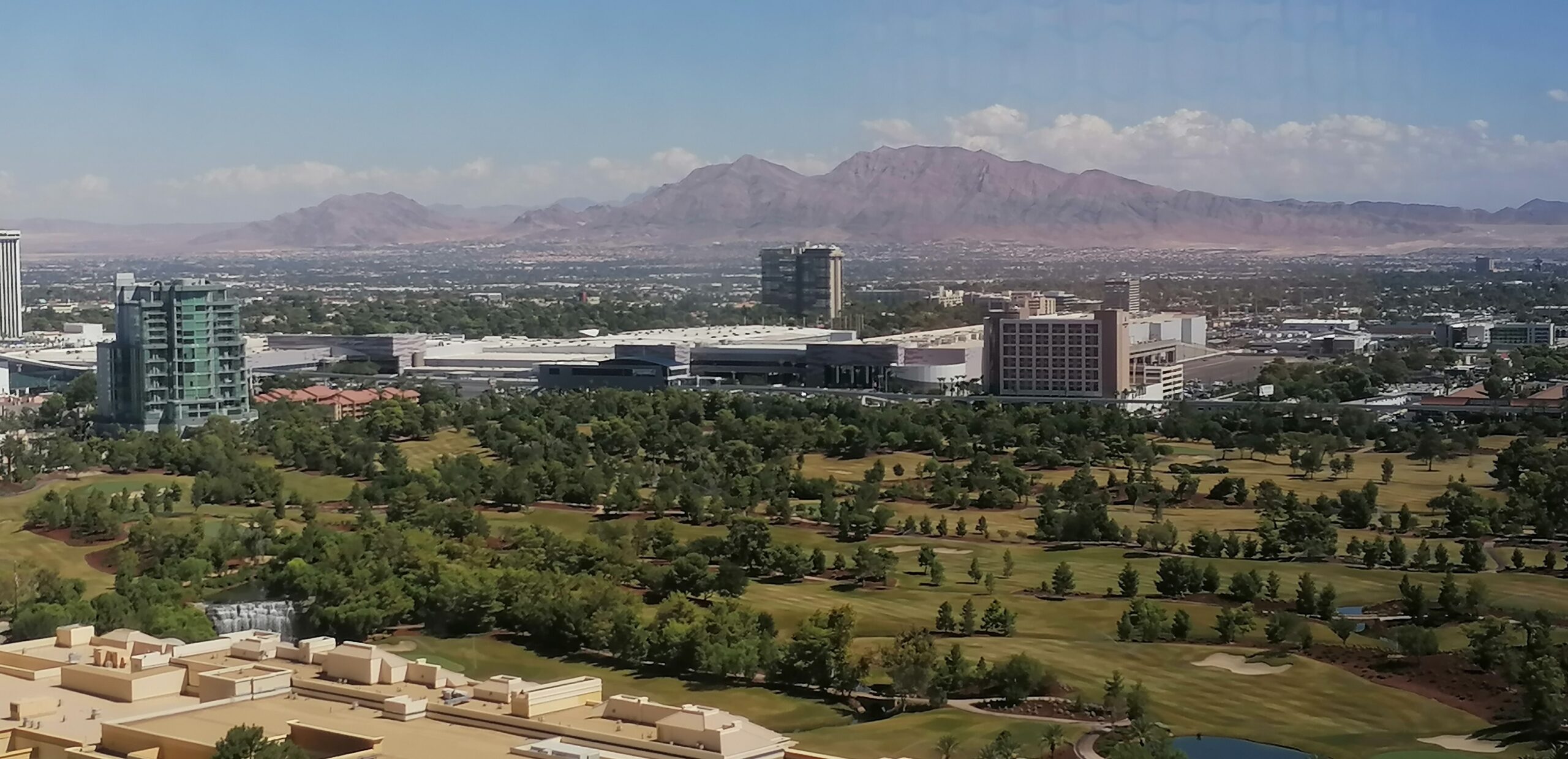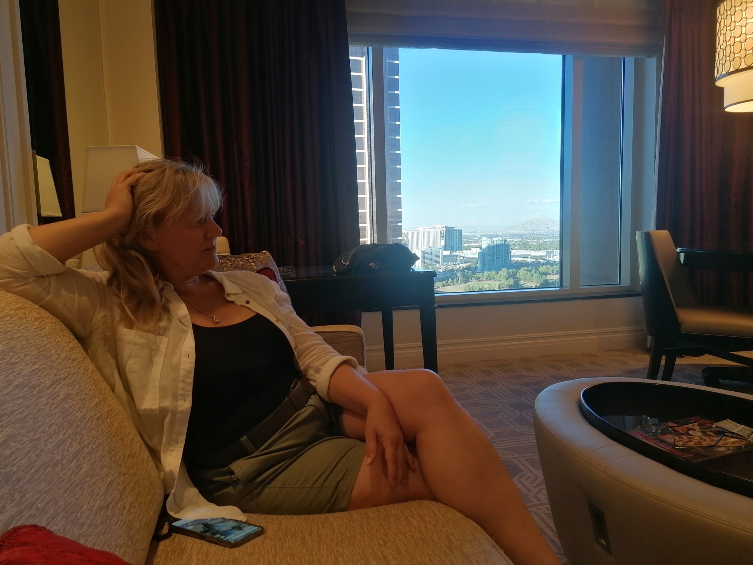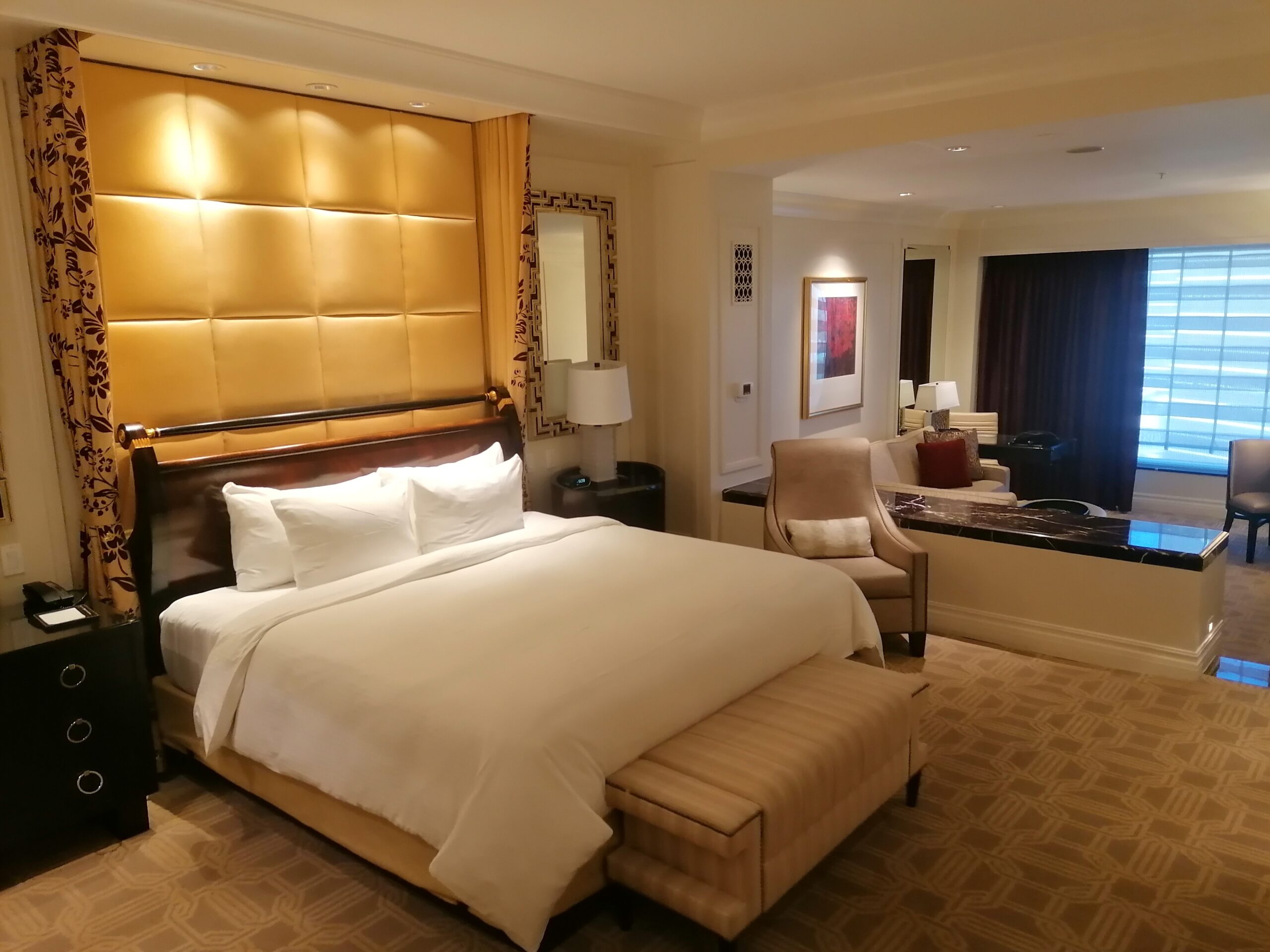 Unsere Suite ist dann auch eher einer kleines Appartement als ein Hotelzimmer. Wir haben einen Wohnzimmerbereich mit Couchecke, Arbeits-und Esstisch, einen Schlafbereich mit einem super gemütlichem Bett (dem besten auf unserer Reise) und ein Bad aus Marmor und Spiegeln. Das super komfortable Hotel-Zimmer, sowie die Aussicht auf die nebenan liegenden Hotels und deren Golfplatz, stimmt uns fröhlich auf die Stadt ein.